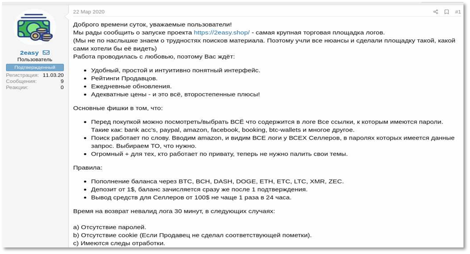 2easy mostly sells so-called Logs, which are archives of data stolen by malware from hacked browsers and systems. Typically, such dumps include credentials, cookies, and information about stored bank cards.
