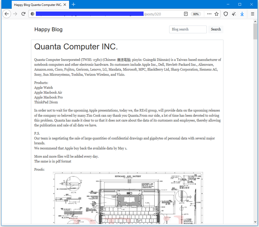 Since the representatives of the hacked company refused to pay after the end of the allocated time, the REvil operators really began to publish the schemes on their website. Apparently, the hackers decided that it might be more profitable to blackmail Apple, one of Quanta Computer’s main customers.