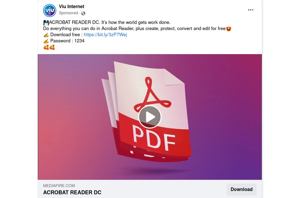 Crooks that use this method to spread RedLine rarely fall into obvious spam that may easily be recognised. Instead, they try to look convincingly enough with banners that include details about the organisation or a person, and are related to their usual business. F or example, using an ISP provider’s account hackers made a post with a link that led to RedLine Stealer downloading, which promoted free Adobe software. It is something people may expect from a provider and appreciate such care about their clients – and thus will eat the bait.