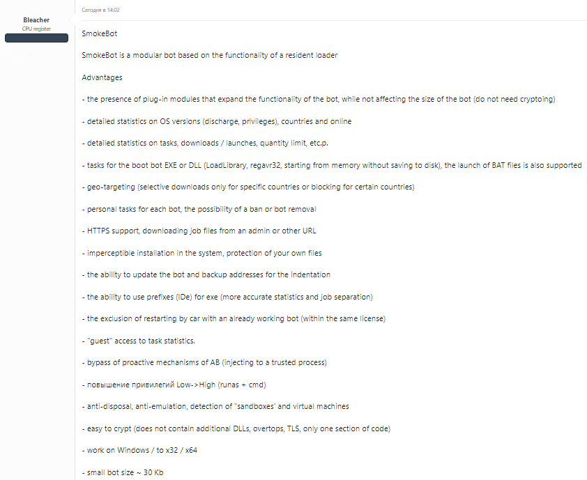 Among key features of SmokeLoader is its immense obfuscation and the choice of C/Assembly as programming language. For the price of $1650, a buyer receives malware and admin panel. Additional plug-in modules can be delivered after the initial injection, but are available for a separate payment. Such a modularity makes this malware way smaller than its counterparts – only 30KB, while most backdoors typically have a size around 150-200KB. Developers of this backdoor usually release an update 1 time a year, bringing new features and modules.